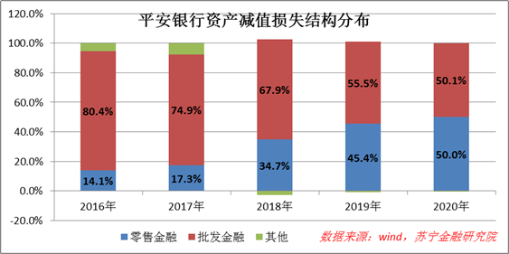 从平安银行的拨备来源看,自2016年以来,零售板块的贡献从14.1%一路攀升至50%,已经与对公板块平分秋色。就这个拨备结构来看,不同的人可能有不同的解读: