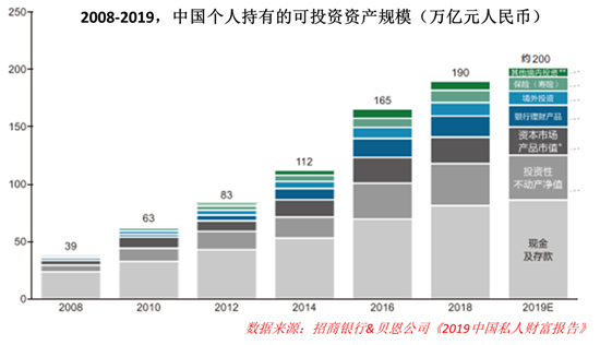 财富结构变化是缓慢的过程,但总规模足够大,中间会带来非常大的机遇。据招行与贝恩发布的私人财富报告,2018年末我国居民可投资资产(扣除自住性房产、耐用消费品、非私募渠道持有的公司股权等资产)总额达190万亿元。从结构上看,现金及储蓄存款约80万亿元,投资性不动产近40万亿元。仅就这120万亿元而言,一个百分点的变动就对应1.2万亿元的规模,空间可想而知。