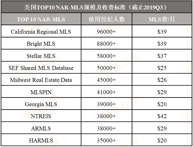 图3:美国TOP10MLS规模即收费标准。来源:各MLS官网;由诸葛找房数据研究中心整理