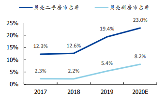 来自券商去年3季度给出的指引,贝壳二手房市占率预计达到23%。鉴于2020年全国二手房成交额并未明朗,对于贝壳这一基本盘真实的市占率水平还不得而知。而根据《华尔街见闻》相关文章显示,“贝壳并没有下沉到四五线市场,在它重点布局的部分一二线、强三线城市,占据市场成交量的50%。”