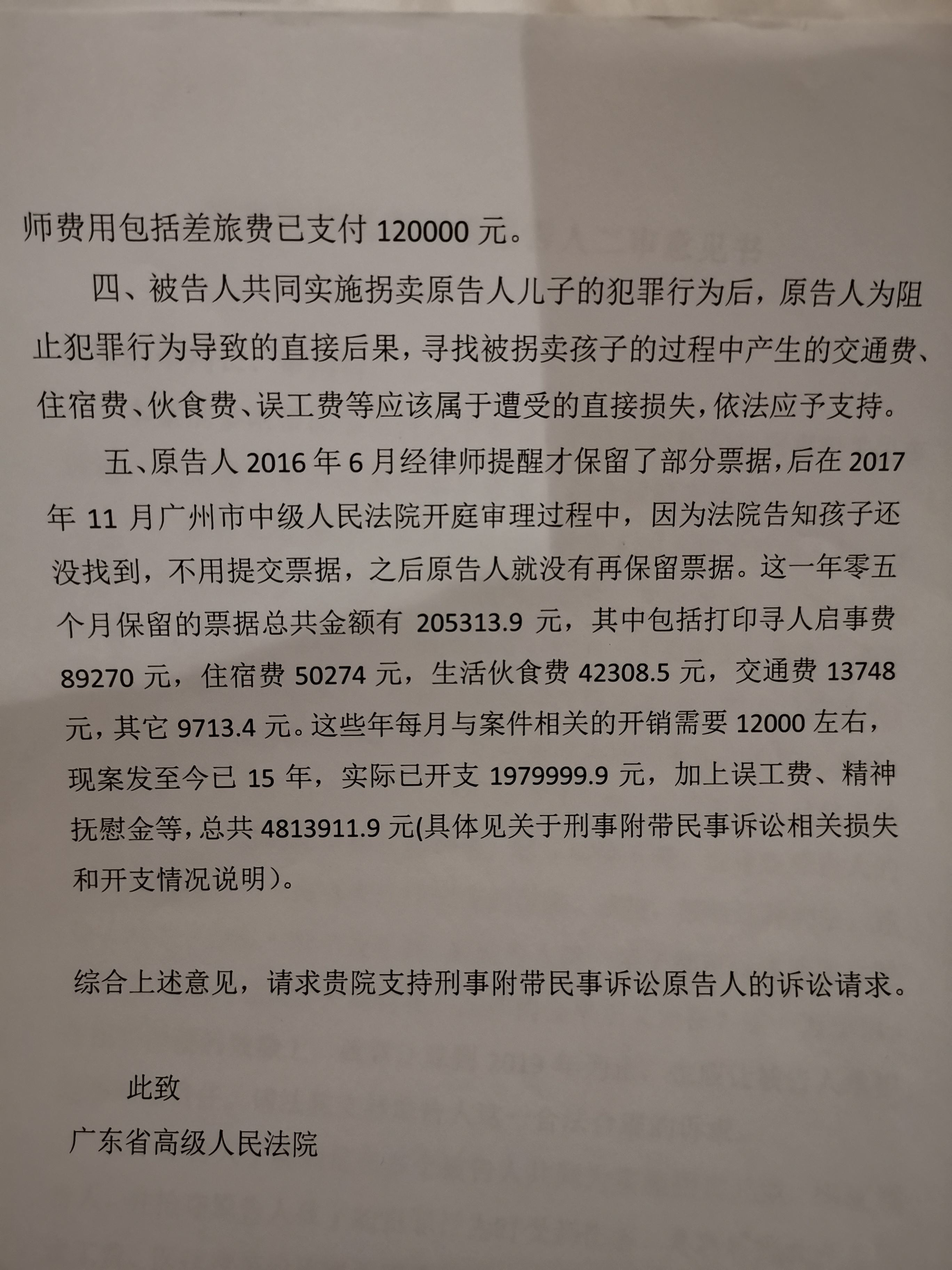 包括申聪在内9名儿童被拐卖案将在广东省高级人民法院二审开庭。2021年3月25日上午,申军良向界面新闻出具了一份“刑事附带民事诉讼原告人二审意见书”(下称“意见书”),请求法院支持被告人承担包括误工费、精神抚慰金在内的各项赔偿金共计481万余元。