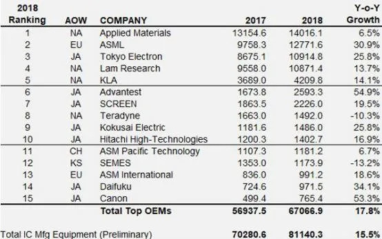 目前,全球半导体设备制造商基本由美日荷三国主导,结合美国半导体产业调查公司VLSI Research和Gartner的数据来看,美国应用材料(Applied Materials)、荷兰阿斯麦(ASML)、日本东京电子(TEL)、美国泛林集团(LamResearch)和美国科磊(KLA)多年来一直是该市场的领导者。