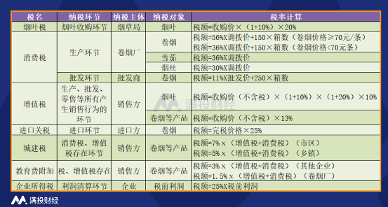 卷烟的烟草税覆盖生产、批发、零售和进口四个环节,每个环节均要征税。在税收方面,烟草税主要包括:烟叶税、消费税、增值税、进口关税、企业所得税、城市维护建设税以及教育费附加这几种主要税种。