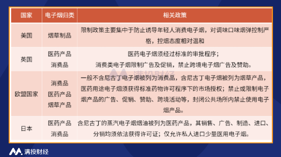英国和日本则将电子烟归为医药产品和消费品,其中英国的医药电子烟必须经过标准的审批程序;消费类电子烟则限制广告及促销,禁止跨境电子烟广告及赞助;日本则将含有尼古丁的蒸汽电子烟烟油列为医药产品,其销售、广告、制造、进口分销均须依法获得许可证;仅允许私人进口少量医用电子烟。