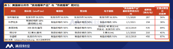 美国的电子烟征税制度方面,美国联邦层面暂无征税,各州市正陆续推进电子烟的征税制度。从税率来看,美国各州在30%~95%不等。其中电子烟征税最高的明尼苏达州,就高达95%。