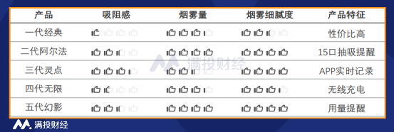 截至2020年,悦刻总共研发生产5款换弹式电子烟和2款一次性电子烟,其中以主打性价比高的一代经典系列和主打大容量、无线充电的四代无限系列最受欢迎。悦刻烟弹口味上新数量多、速度快,且不同系列烟弹不通配,以保证其烟弹复购率。