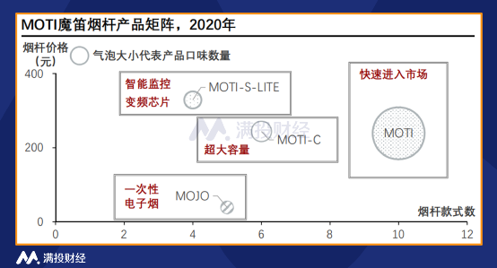 MOTI-C配置500mA超大容量电池(普通电子烟电池容量为350mA)和2ml烟弹(普通烟弹为1.8ml),且外观设计为单色款(商务黑色、灰色、银色)和渐变色款(极光色、马卡龙色),以凸显电子烟时尚的特性。