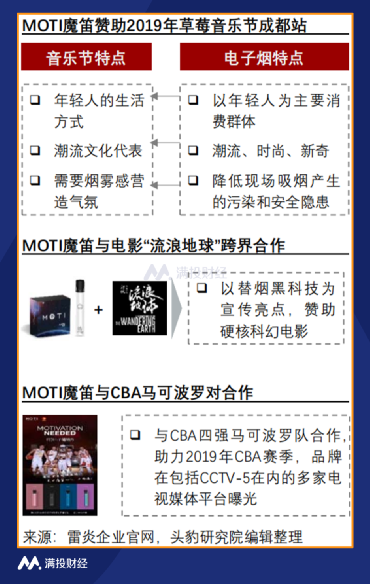 魔笛通过精准营销的策略打开市场,其与草莓音乐节合作,通过电子烟的时尚潮流打开年轻群体;还曾与流浪地球跨界合作,发行授权联名款电子烟3000支,两周内售罄;赞助CBA马可波罗队,利用场地优势精准营销,提高品牌在年轻男性群体的地位。