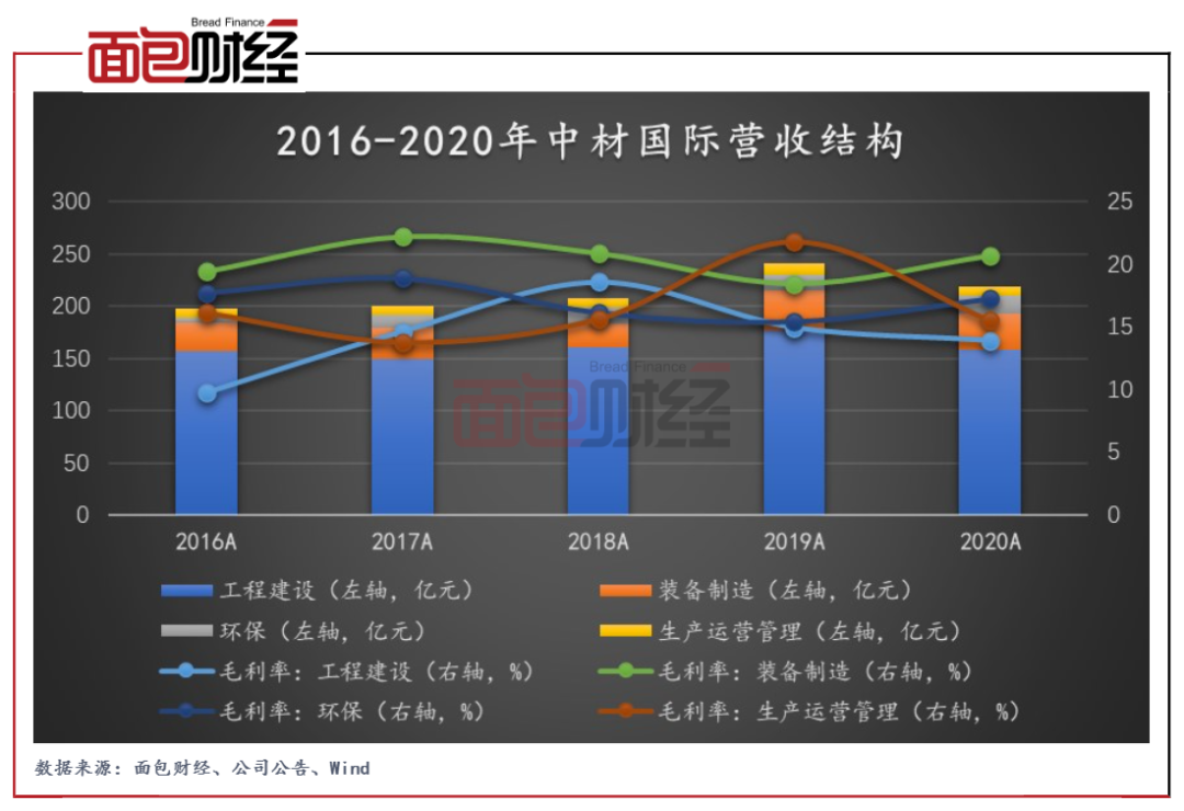 分产品看,2020年公司工程建设、装备制造、环保和生产运营管理分别实现营收157.98亿元、34.59亿元、17.03亿元和8.98亿元,同比分别下降10.74%、下降9.88%、增长15.53%和下降18.05%;毛利率分别为13.9%、20.7%、17.2%和15.5%,同比分别下降1.04个百分点、上升2.23个百分点、上升1.83个百分点和下降6.27个百分点。
