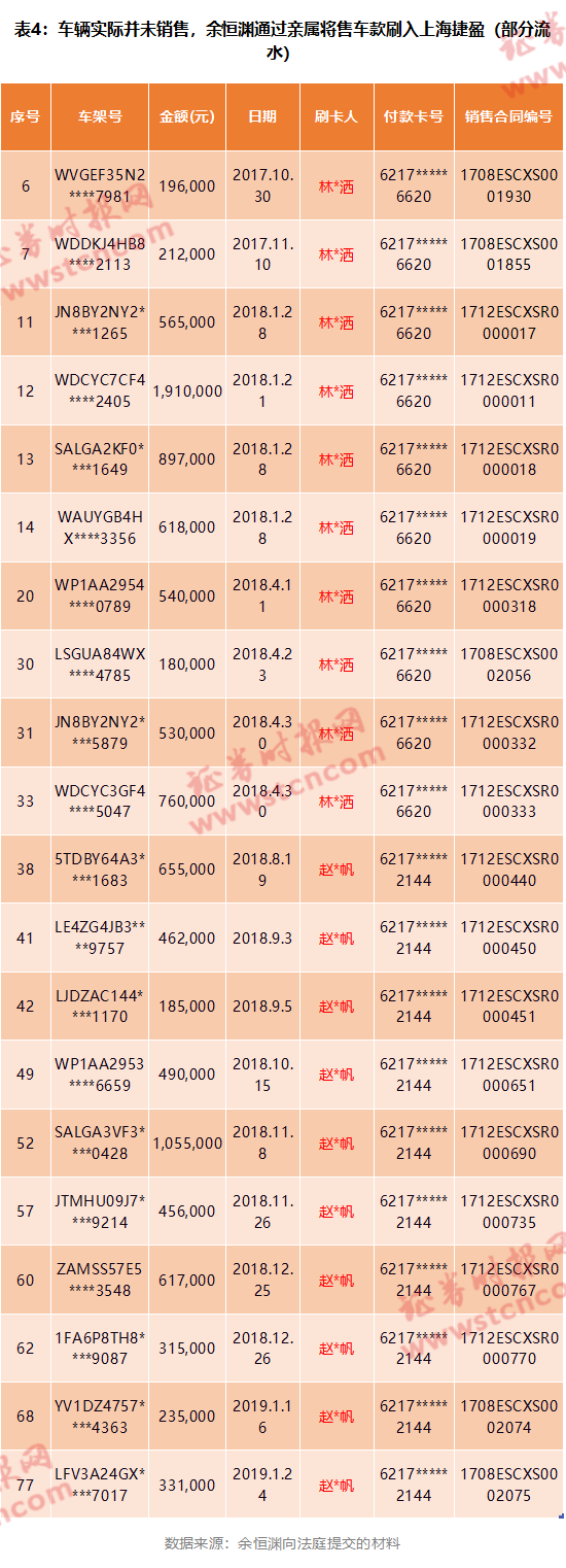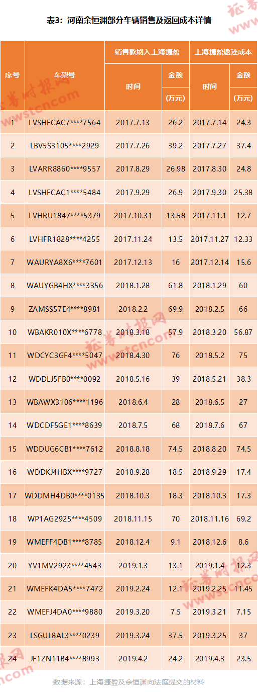 而由上海捷盈出具的材料显示,双方自2017年7月至2019年4月合作期间,其账户共计收到656台车的车款。证券时报记者随机每月抽取了一台车的资金流水轨迹,皆符合上海捷盈先收取车款,再向余恒渊个人账户返还成本的特征(表3)。