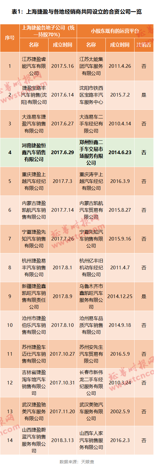 按照类似方式,2017年5月至2018年3月期间,开心汽车通过上海捷盈在全国物色了14家合作方,设立了14家控股的合资公司,分别位于内蒙古、宁夏、河南、重庆、大连、沈阳、吉林、苏州、新疆、杭州、江苏、山西、武汉、沧州(表1)。上海捷盈的境外控股母公司开心汽车在纳斯达克披露,“尽管每一笔收购是独立谈判的,但都是类似方式进行的”。