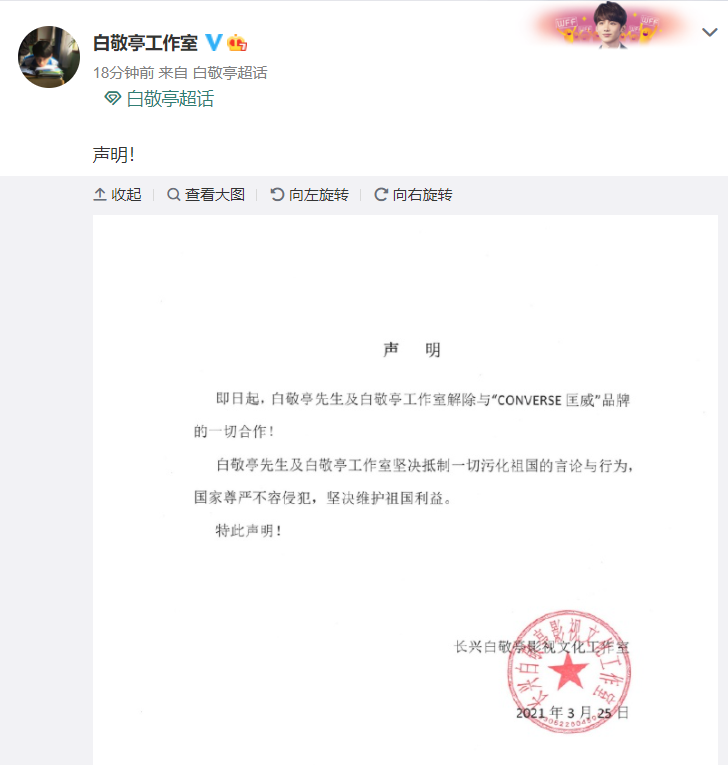 3月25日,@白敬亭工作室 微博发声明称,解除与匡威的一切合作。