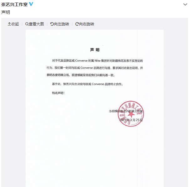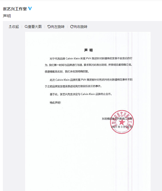 3月25日消息,@张艺兴工作室 微博发布两则声明,决定与CONVERSE和Calvin Klein终止合作。