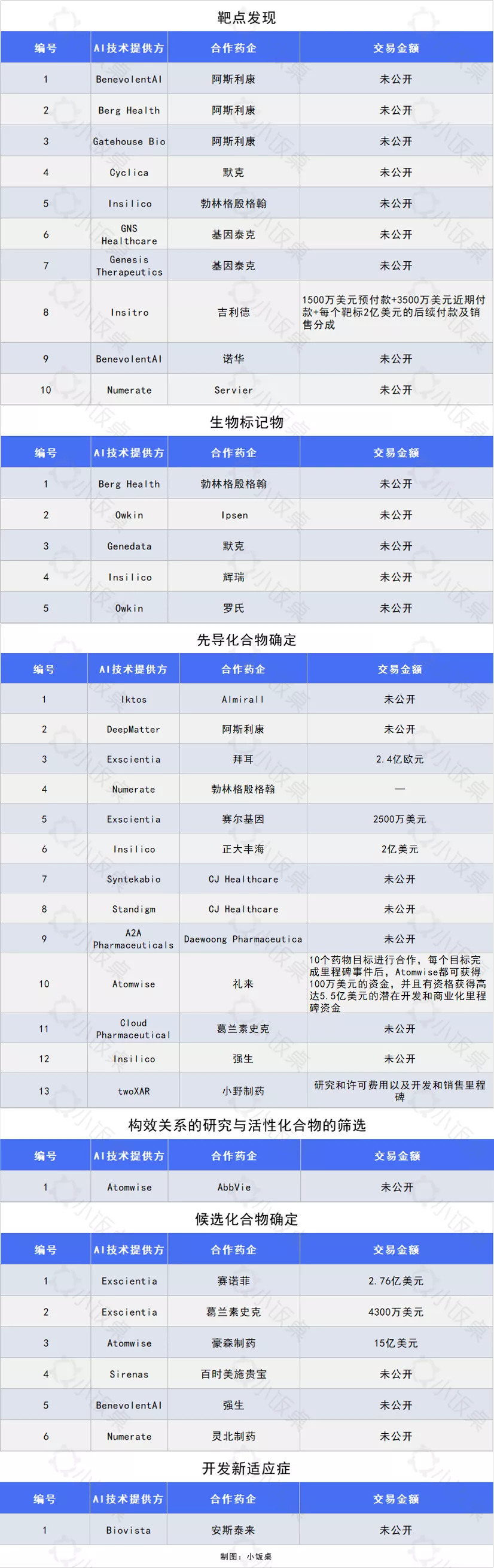一些全球头部药企对AI制药企业也更积极拥抱。小饭桌按照公开数据统计(详细见下图),诺华、拜耳、强生等等企业都已经和AI制药企业合作,很多交易金额在上亿美金以上。