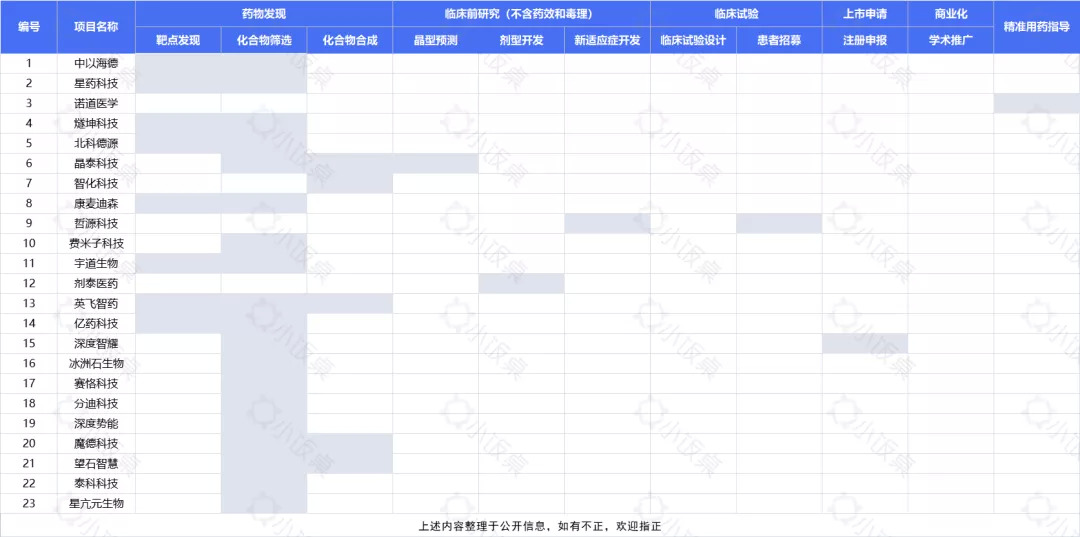 小饭桌根据公开资料统计了部分AI制药企业的布局环节。从图中不难看出,药物发现阶段的靶点发现和化合物筛选这两个药物发现的最核心环节,也是参与者较多的环节。
