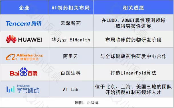 擅长捕捉机会的巨头也都纷纷涌了进来。腾讯成立云深智药、百度成立百图生科、阿里云与全球健康药物研发中心合作开发AI药物研发和大数据平台,而华为、字节跳动也在积极布局。