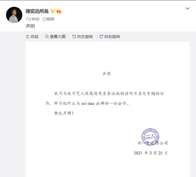 3月25日,香港歌手陈奕迅在微博发布声明称,终止与阿迪达斯的一切合作。