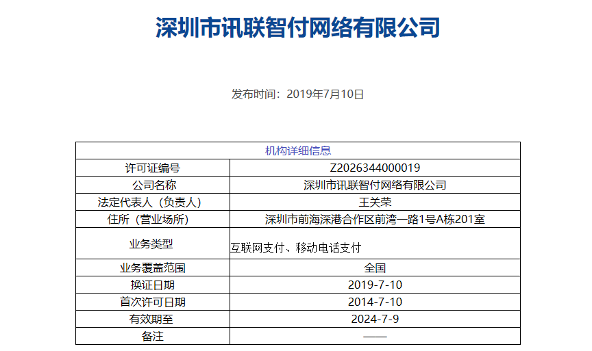 央行官网显示,讯联智付2014年就拿到了支付牌照,2019年换证后,主要的业务类型为互联网支付、移动电话支付,到期日期为2024年。