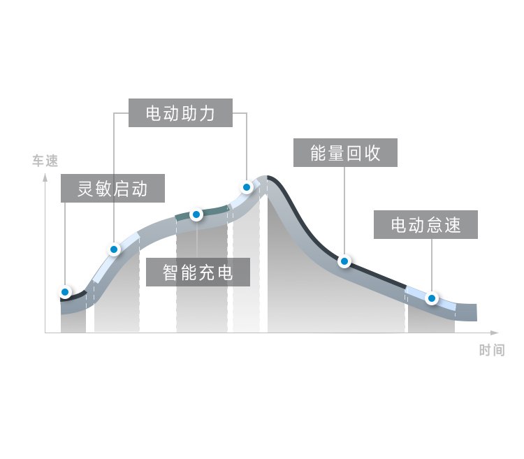 加速时,若电量充足,电机会率先助力,为整车提供额外推力。平稳行驶时,电池智能充电。车辆断油滑行或制动减速时,车辆进行制动能量回收,将该部分能量转化为电能,储存在48V电池中。