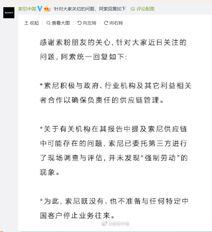 索尼称,“关于有关机构在其报告中提及索尼供应链中可能存在的问题,索尼已委托第三方进行了现场调查和评估,并未发现‘强制劳动’的现象。”