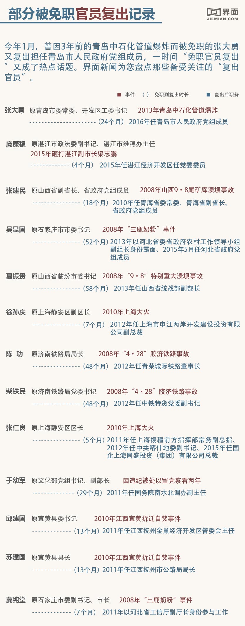 今年1月,曾因三年前的青岛中石化管道爆炸而被免职的张大勇又复出担任青岛市人民政府党组成员,一时间“免职官员复出”又成了热点话题。界面新闻为您盘点那些备受关注的“复出官员”。
