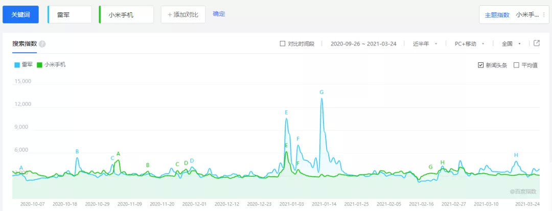 显然,外界也一直倾向于将雷军与小米划等号。百度搜索指数的“雷军”和“小米手机”相关指数显示,雷军与小米手机的曲线除个别时间外,高度重合。这意味着,网友在对小米手机或雷军进行搜索时,必然会带上对方,二者在用户心智中已然是“捆绑”状态。