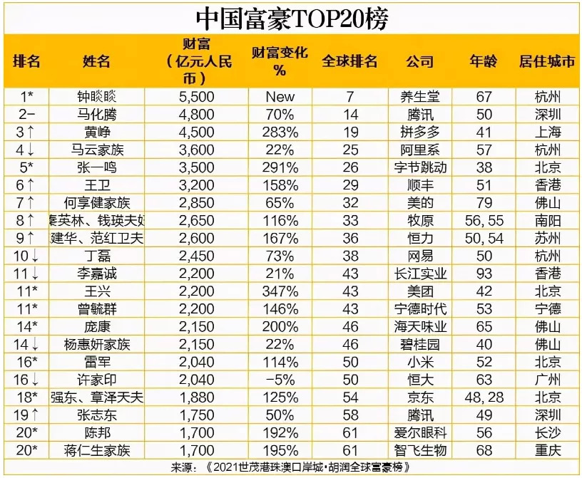 不过,2021中国富豪榜的排名却是变数颇多。以《2021胡润全球富豪榜》为例,中国富豪榜前三分别为农夫山泉掌门人钟睒睒、腾讯的马化腾和拼多多的黄峥,而且胡润研究院指出,这是有史以来,房地产企业家首次名落榜单,连2020年位列前五的李嘉诚和恒大地产许家印也双双跌出前十。