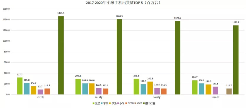 过去三年,全球手机大盘表现萎靡,手机出货量由14.66亿台下降至12.92亿台,三年下降了11.8%。