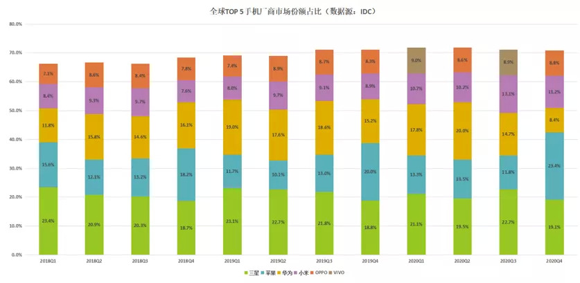 反观中国品牌,华为、小米分别在三年间增长22.6%和59.4%,成为全球市场的最大赢家。