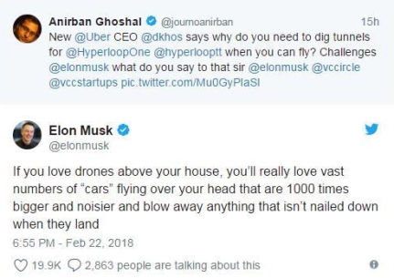 第二是便是市场接受度的问题。例如,飞行汽车采用电动化分布式推进,实际运行噪声远比直升机小,但城市空中交通的运行频次较现有直升机城市运行要密集很多,对城市人类生活到底会产生多大影响,公众能否接受都尚未可知。至少,一向对新事物接受度挺高的埃隆·马斯克就不太能接受,他曾在Twitter上怼过Uber的飞行汽车。