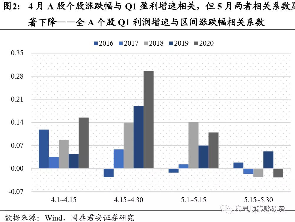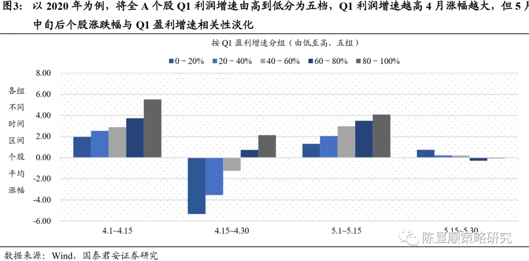 市场是有效的,在实际业绩披露前,市场通过股价涨跌发挥价值发现功能。我们以两组数据佐证前文结论:1)我们将2016~2020年的4月和5月等分为四个区间段,计算每个区间全部A股涨跌幅与Q1利润增速排序的相关系数,4.1~4.15、4.15~4.30、5.1~5.15、5.15~5.30四个时间段个股涨跌幅与盈利增速排序的相关系数(过去5年均值)为0.09、0.13、0.06、0.00。即4月,尤其是4月下旬,股市行情最易受盈利预期主导;2)以2020年为例,我们将全A个股Q1利润增速由低到高分为五档,可见在4月和5月上旬三个时间段,Q1利润增速越高的档位平均涨幅越大,5月下旬后涨跌幅与利润增长相关性淡化。上述现象说明市场是有效的,在实际业绩披露前,市场通过股价涨跌发挥价值发现功能。而在一季报披露之后,股价反应的是季报之外新的信息和预期变化。