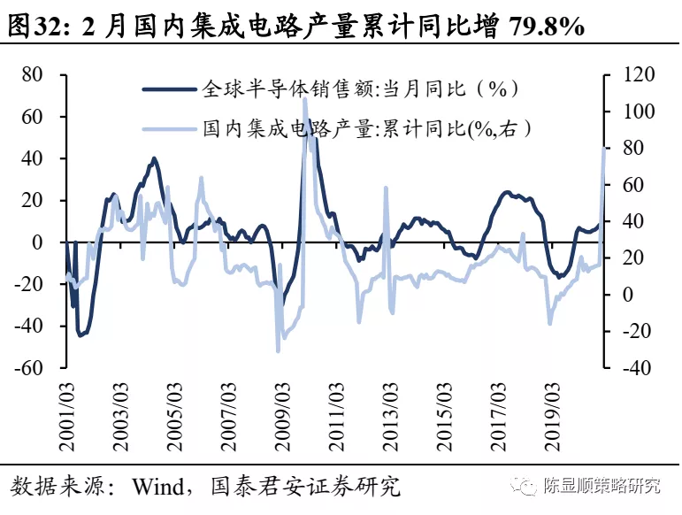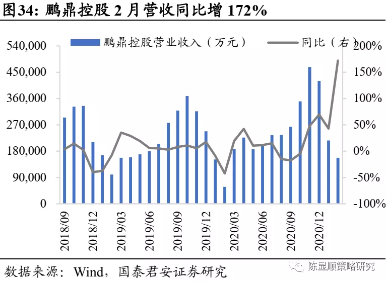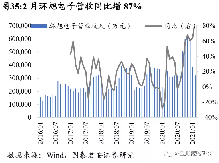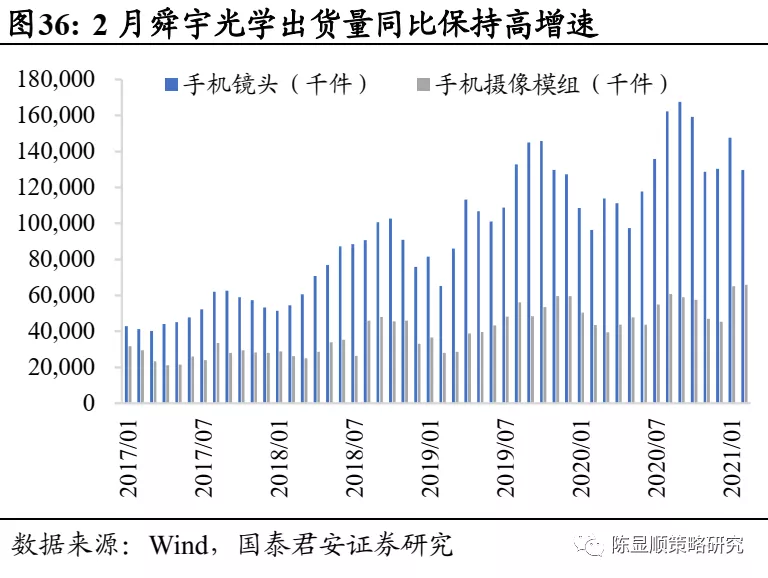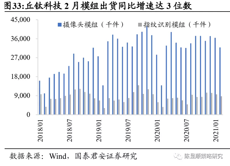 消费电子:手机零部件出货量大增,面板涨价周期或延长。丘钛科技2月摄像头模组、指纹识别模组出货分别达到3187万件和875万件,同比增速分别为129.29%和139.29%,不仅较2020年同期有较高增长,较2019年2月增速也分别超过129%和177%。鹏鼎控股2月营收同比增172.10%达到15.7亿元,较2019年2月增57%。环旭电子2月营收同比增87.09%,达32.1亿元,较2019年2月增51%。舜宇光学2月手机镜头出货量、手机摄像模组出货量分别为1.29亿件、6594万件,同比分别增34.39%和51.62%,较2019年2月分别增98.9%和134.3%。3月32寸、55寸液晶面板价格维持涨势,当月同比分别上涨8.45%和6.28%,平板、手机和笔记本面板分别维持或者创下新高。