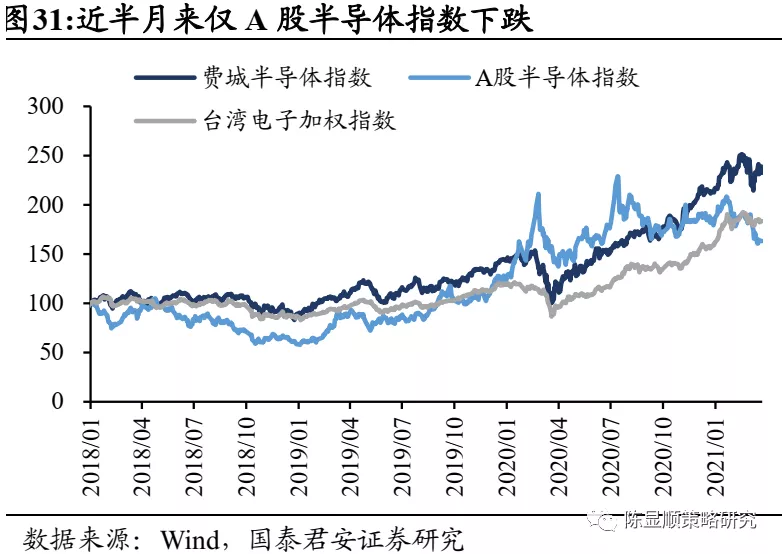 半导体:主要半导体指数涨跌互现,面板驱动IC供给收紧。3月5日至22日,费城半导体指数涨5.37%收3077.55点,A股半导体指数跌10.27%收1521.22点,台湾电子加权指数涨1.58%收815.26点。2月国内集成电路产量累计同比增79.8%。液晶面板用驱动IC由于毛利较低,产能被汽车芯片挤出,面板价格周期或因此延长。