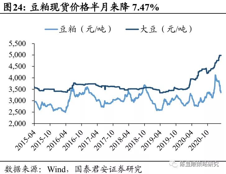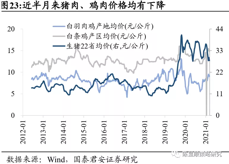 农产品:上半年预期生猪出栏量同比增65%,4月猪价有望继续走低。截至3月19日,22省市猪肉均价近半月下跌5.29%,白羽鸡均价亦改变上行走势,近半月降1.97%。蔬菜价格维持下行,近半月降16.23%。豆粕现货价格下跌7.47%,从3月5日的3638.86元/吨降至22日的3367.11元/吨。猪肉降价主要是由于国内生猪产能的持续修复。农业农村部相关负责人指出,2021年以来全国生猪基础产能持续恢复,预计上半年生猪出栏量同比增长65%左右,生猪出栏量将继续保持较大幅度增加的趋势。3-4月是猪肉消费淡季,预计猪肉市场价格还有下降空间。