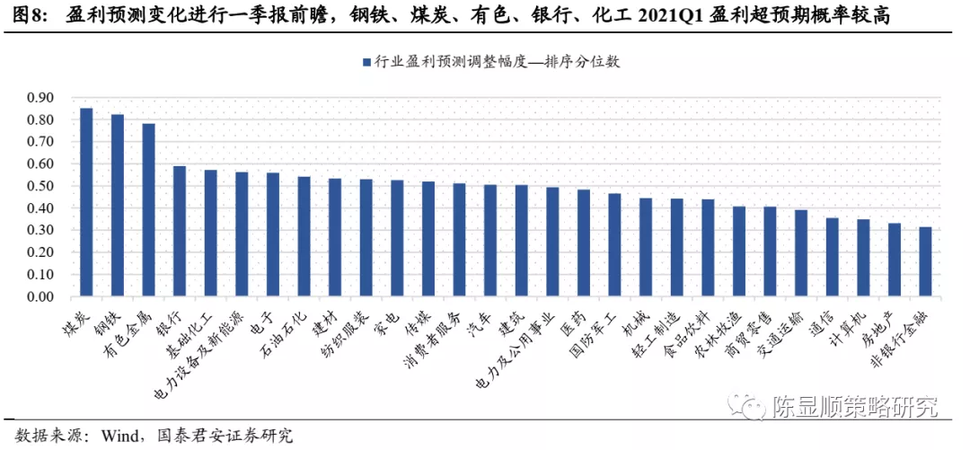 以2020年数据验证,不管从个股还是行业层面,盈利预测调升幅度与4月上涨概率/平均涨幅正相关,且这种相关性在进入5月后下降。透过盈利预测变化进行一季报前瞻,钢铁、煤炭、有色、银行、化工2021Q1盈利高增概率较高,中信二级行业中普钢、稀有金属、煤炭开采、化学纤维、煤化工业绩高增概率较高。