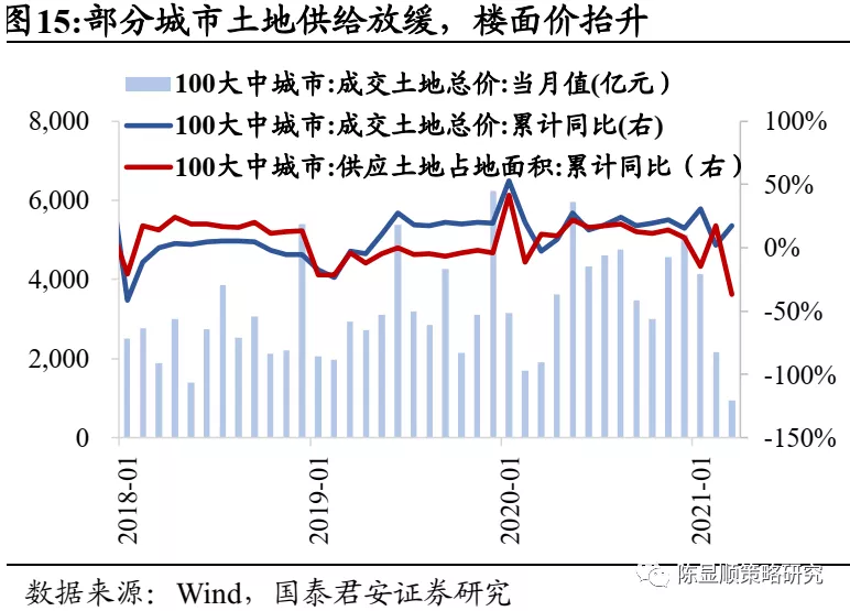 新开工与销售短期背离,供给受限土地出让同比下滑。2021年1-2月新开工面积1.70亿平方米,较2019年复合增速为-4.8%,环比增速远低于疫情前三年均值。土地出让方面,100大中城市供应土地占地面积至3月下旬累计同比下降27.2%,主要是因近期部分城市土地供给节奏放缓,但房企拿地意愿不弱,成交楼面价有所抬升。