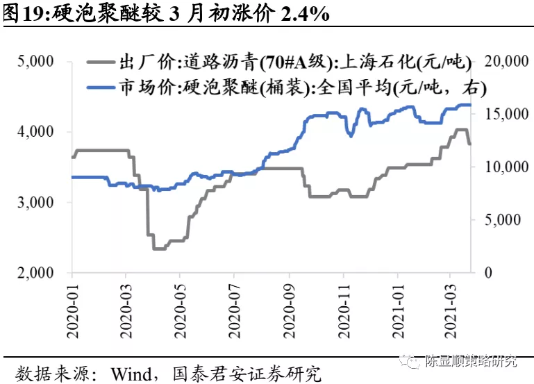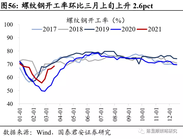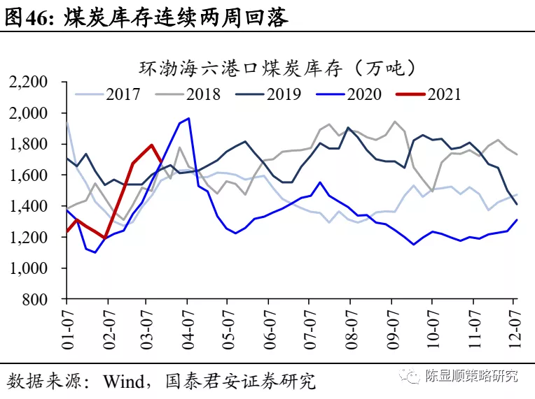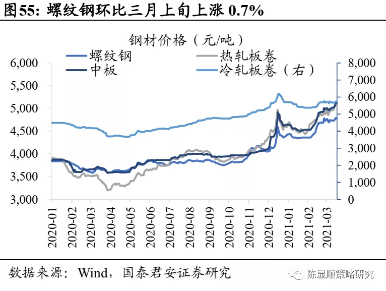 建材需求回暖钢材加速去库,全年粗钢产量预期下降。建筑施工需求回暖,长三角水泥企业发货率恢复到8成左右,螺纹钢价格环比两周前上涨0.67%,冷轧板卷环比涨0.18%。钢材库存去化加速,螺纹钢、冷轧板库存环比3月上旬分别下降1.31%/0.56%。碳中和背景下,2021年粗钢产量大概率同比下降。