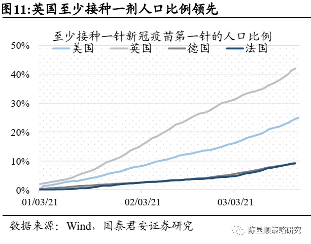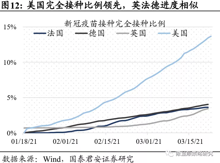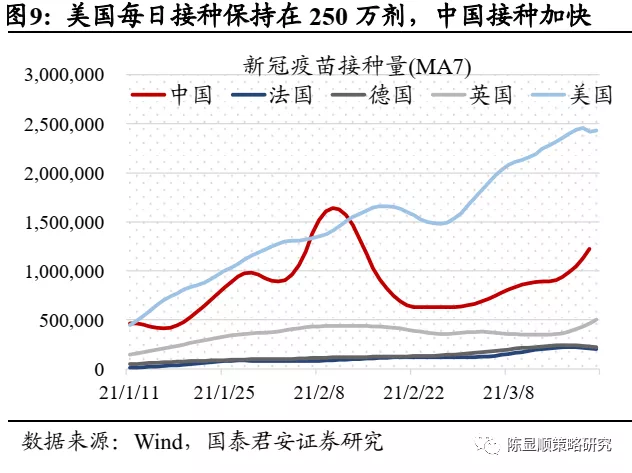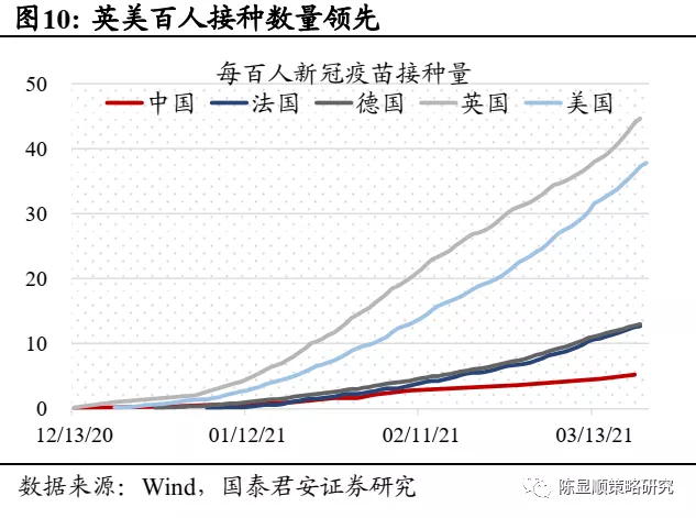 新冠疫苗接种:美国接种速度继续加快,法德疫情席卷重来。截至3月23日,法、德7日移动平均新增确诊病例环比两周前大幅上升37.25%/52.58%,英、美下降5.65%/5.99%;疫苗接种速度方面,美、英七日平均接种速度分别为243万/50万剂,美国日接种速度加快至250万剂,群体免疫时间或将进一步提前至6月。疫苗接种比例方面,每百人接种量角度看,英、美分别为44.60/37.83剂,于大型经济体中领先,法、德接种进度缓慢,分别为12.66/12.96剂,中国为5.21剂(3月20日);至少接种第一针的比例上,英国领先(为41.89%),美国24.86%。法、德分别为9.21%/9.04%。疫苗完全接种人群比例上,美国增至13.68%,环比两周前增加4.09pct,进度加快,英国第二针接种进度终于开始加快,环比增加1.70pct至3.41%,法德分别为3.61%/4.02%。