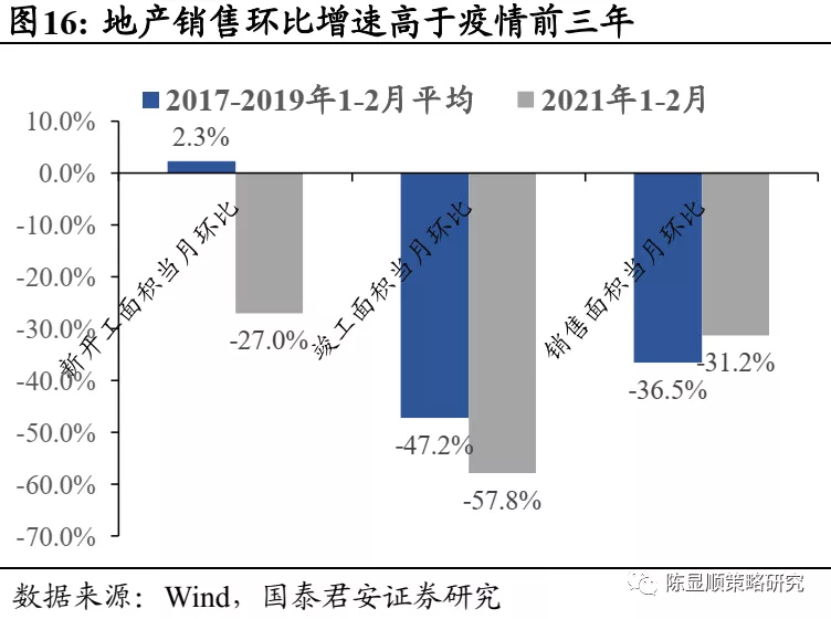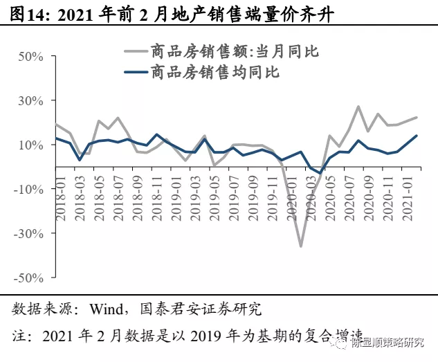 地产销售:销售环比增速高于往年同期,房市销售呈量价齐升态势。2021年1-2月商品房累计销售面积1.74亿平方米,同比增长104.9%,以2019年为基期复合增速为11.0%;累计销售金额1.91万亿元,同比增长133.4%,过去2年复合增速为22.3%。环比口径看,1~2月销售面积增速高于疫情前三年(2017-2019年)均值。商品房销售均价为1.1万元/㎡,环比增13.0%,房市整体呈现量价齐升的态势,核心原因是股市进入震荡期后,居民对房产配置意愿边际提升,加之房企快周转以促进销售回款。但近期多地银行开始严查违规信贷资金进入房市,3月全国首套房产贷款利率上升2bp,预计未来销售增速将略有收窄。