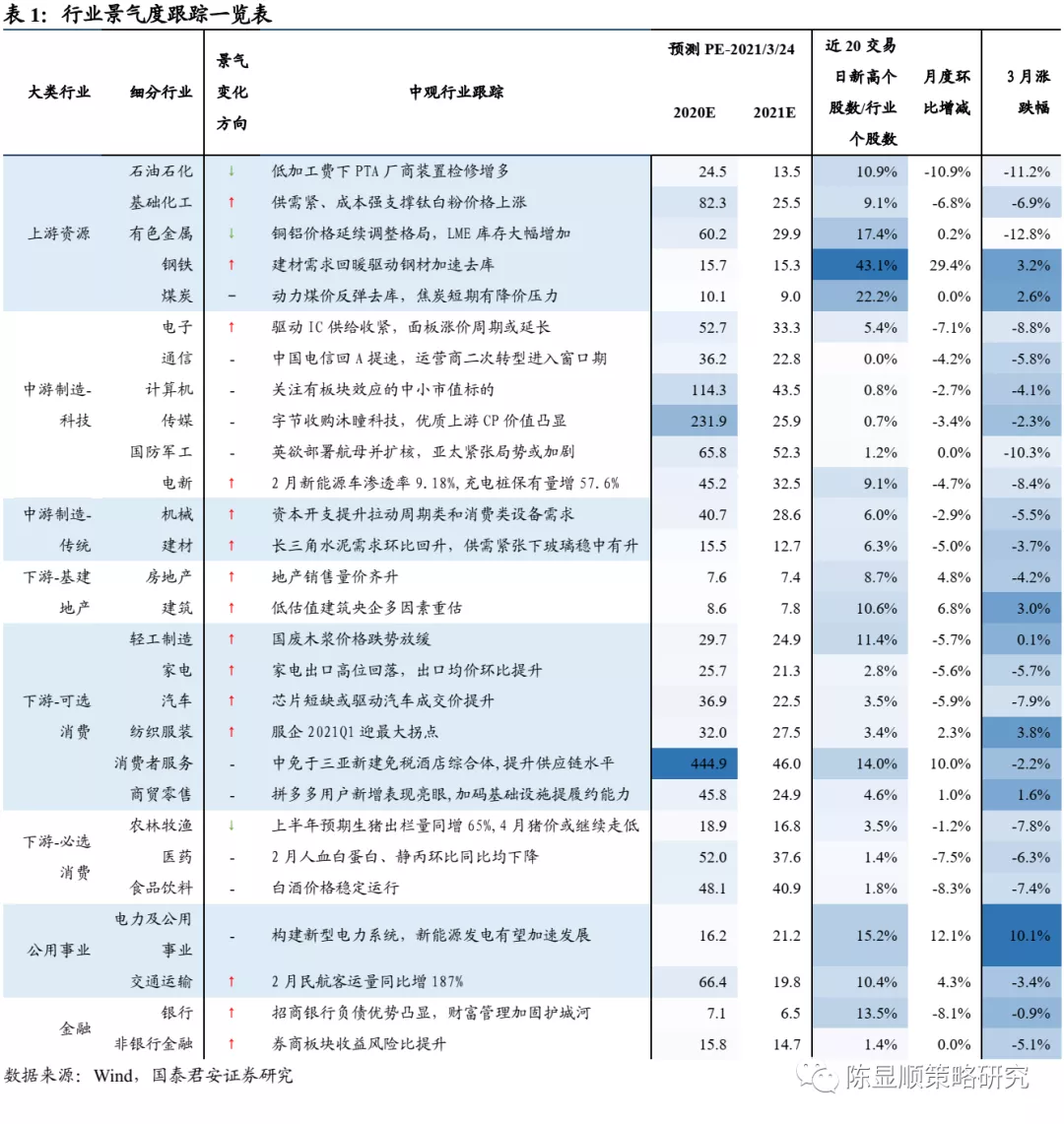 策略维度如何进行一季报前瞻?来自盈利预期变化的代理变量。截至3月25日,两市仅有127家公司公布一季报业绩预告。从策略视角如何进行一季报前瞻?由于1月末和2月末上市公司会密集公布2020年报业绩,对应时点行业分析师将集中调整2021年盈利预期,假设该时点行业分析师会根据Q1企业经营环境和条件调整21年盈利预测,我们可将3月末分析师对个股盈利预期较年初的变化,作为Q1盈利的代理变量。