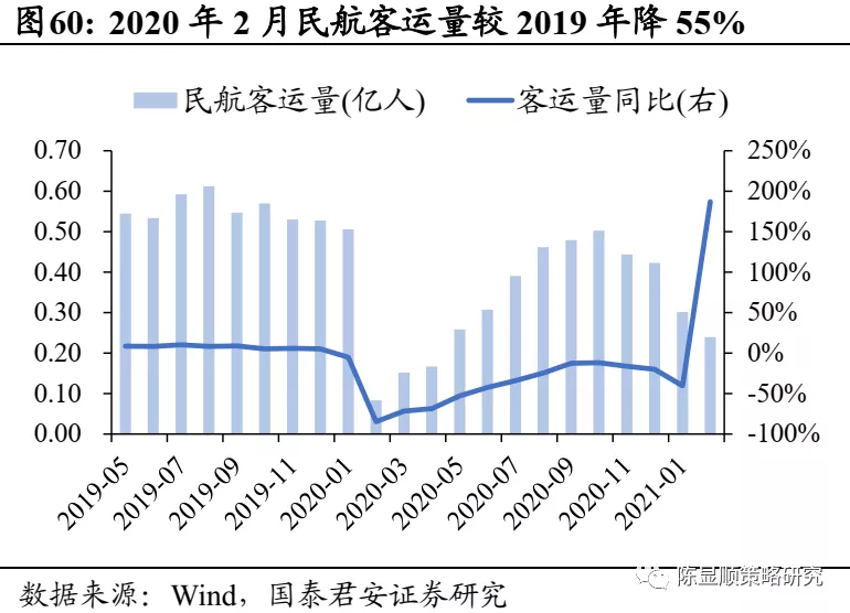 公用事业:2月规上快递业务稳定增长,民航客运量同比增187%。2月规模以上快递业务当月收入为515.7亿元,当月同比增速为41.5%,较2019年2月增加47.3%。2月民航客运量同比大幅增加187%,但较2019年2月下降55%。民航局表示行业将力争全年运输总规模恢复至疫情前80%以上,旅客运输量恢复至疫情前90%左右,货邮运输量与疫情前基本持平,努力实现航空企业减亏增盈。