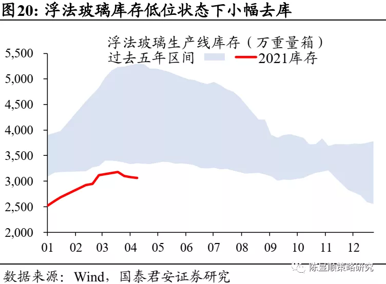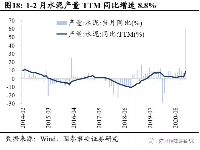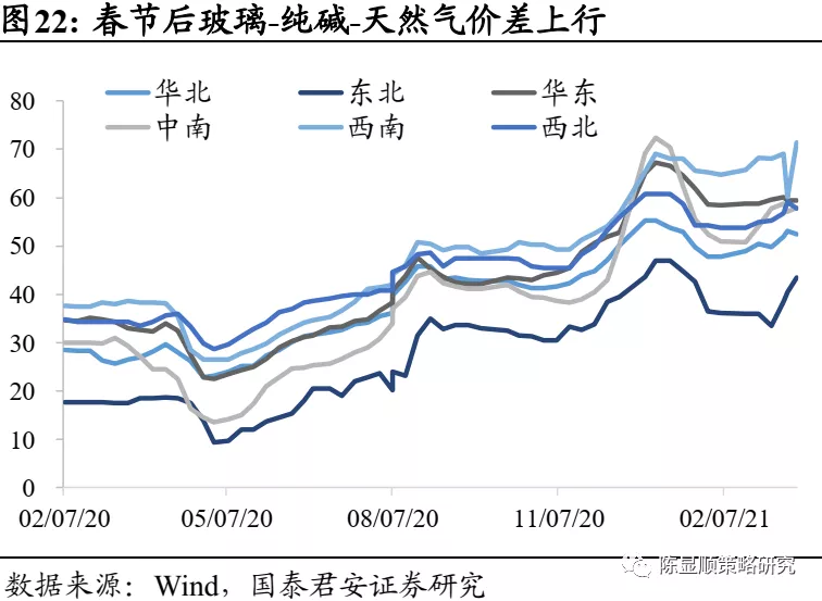 基建地产施工:长三角水泥需求环比回升,供需紧张下玻璃价格稳中有升。2021年1-2月水泥产量TTM同比增速8.82%,长三角地区水泥需求环比回升,企业发货率恢复到8成左右,3月下旬全国水泥价格环比半月前上涨0.6%。浮法玻璃仍受供给紧张和竣工端需求旺盛驱动、库存低位下降、价格稳中有升,3月下旬浮法玻璃现货价格较两周前上涨0.93%。此外,春节后玻璃-纯碱-天然气价差再次呈现上行趋势,玻璃行业利润空间有望扩展。