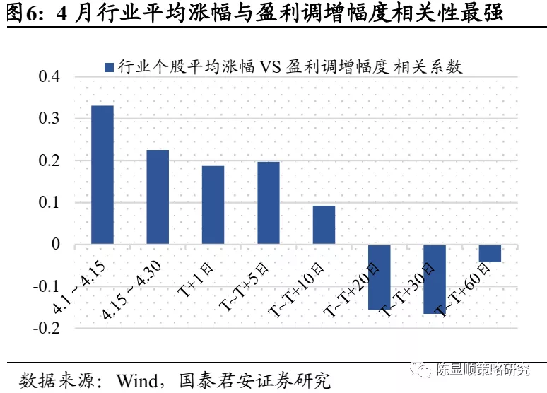 在谈论一季报时,我们实际在讨论什么?4月A股将进入业绩密集披露期,4月15日前深市主板和中小板将有条件披露一季度业绩预告,4月30日前全部A股披露年报和一季报,故而在4月中旬和月末形成两大业绩披露高峰期。行研也多在3月前后发布一季报前瞻,当投资者在关心一季报的时候,一季报实际如何影响市场?我们发现,Q1盈利增速与个股4月涨跌幅相关度最高,而在Q1业绩实际披露之后的5月两者相关系数显著下降。即一季报在业绩预期博弈阶段(4月)对市场影响度最高,在实际业绩落地之后(5月)影响程度下滑。