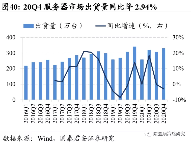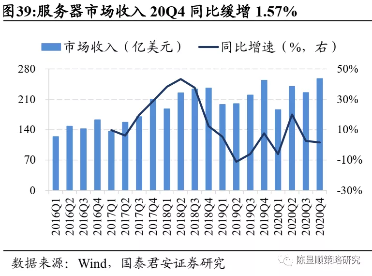 服务器:全球市场收入规模同比缓增,出货量同比有所降低。据IDC统计,20Q4全球服务器市场收入为258亿美元,当季同比增1.57%,较Q3下降1个百分点,市场出货量为330万台,同比增速为-2.94%。