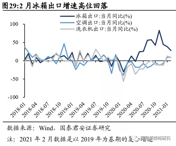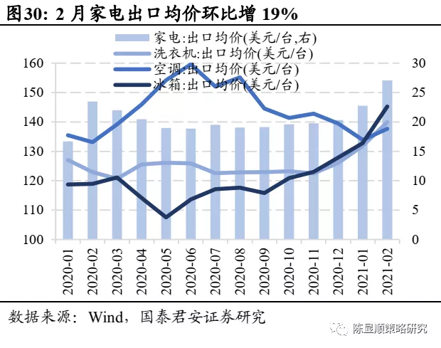家电:冰箱出口高位回落,受原材料涨价影响,家电出口均价环比提升。2021年2月冰箱、空调、洗衣机当月出口同比分别为135.58%、98.55%、171.88%,以2019年为基期复合增速为28.03%、9.42%、8.80%。冰箱出口增速高位回落,空调、洗衣机出口增速维持高位。受原材料涨价影响,1月初国内家电品牌开启密集提价,2月家电出口均价环比增20%,其中冰箱、洗衣机、空调出口均价分别环比增9.4%、6.1%、2.8%。