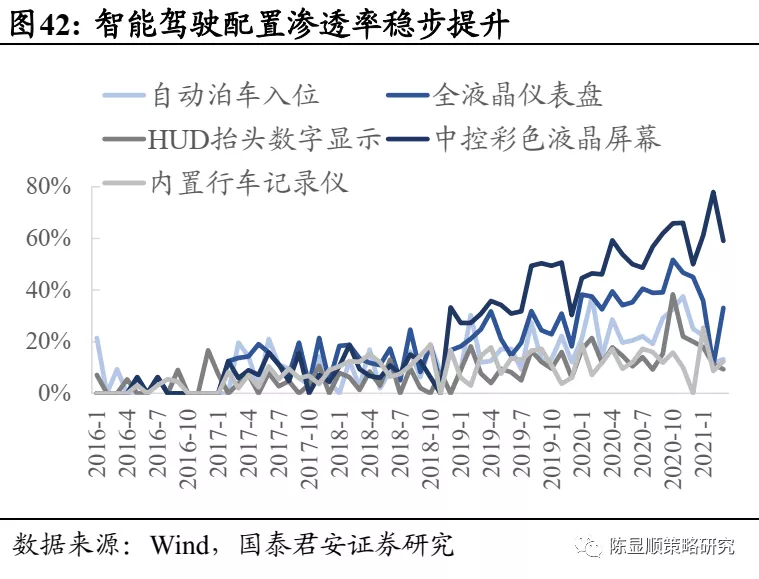智能驾驶:全液晶仪表盘渗透率超30%。3月初至21日,市场发布新车484款,智能驾驶配置中,自动泊车入位渗透率为13.22%(较上月+2%),全液晶仪表盘渗透率为33.06%(+22%),HUD抬头数字显示渗透率9.3%(-2%),中控彩色液晶屏幕渗透率59.09%(-19%),内置行车记录仪渗透率为12.4%(+4%)。