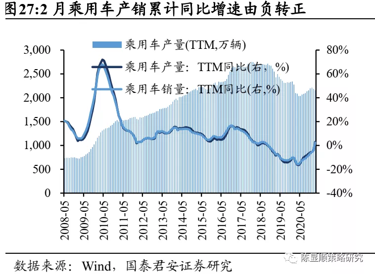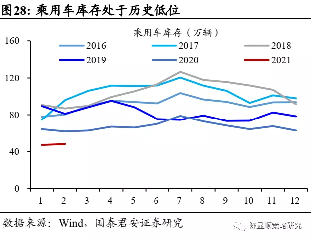 汽车产销:3月乘用车预计销量174万辆,芯片短缺或驱动成交价提升。2月乘用车累计产销同比增速由负转正,产量累计同比增速从1月的-4.08%转为2月的2.84%,增加6.92个百分点,销量累计同比增速由-3.73%转为2.3%,增加6.03个百分点。乘联会预计3月乘用车销量约为174万辆,当月同比增长约66.0%,环比2月增长47.5%。当前乘用车库存处于近五年历史低位,受部分厂商面临芯片短缺的影响,车型缺货或将驱动成交价提升。