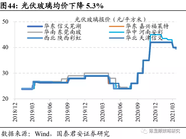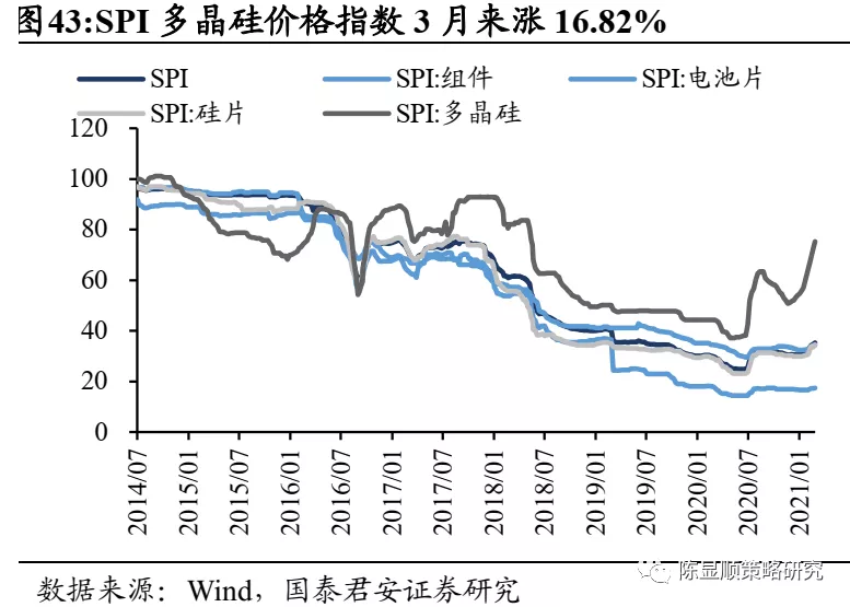 光伏:SPI多晶硅价格指数3月涨16.82%,光伏玻璃均价下降5.3%。3月SPI多晶硅综合价格指数涨16.82%,从2月26日的64.4涨至3月22日的75.23,组件、电池片和硅片也有不同幅度上涨,分别上涨4.42%、4.32%和12.39%。22日光伏玻璃均价有所下降,所观察的六家企业3.22mm镀膜价格均价为39.92元/㎡,较2月26日的42.17元/㎡下降5.3%。