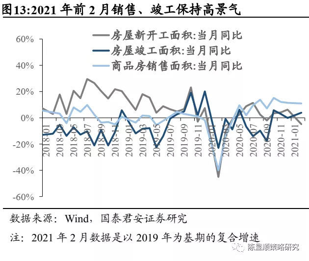 房市销售端量价齐升,贷款利率回升或抑制购房需求。房市销售呈量价齐升态势,2021年1-2月商品房销售面积同比增104.9%,以2019年为基期复合增速为11.0%。环比口径销售面积增速高于疫情前三年均值。全国商品房销售均价环比增13.0%。股市进入震荡期后,居民对房产配置意愿边际提升,加之房企加快周转,两大因素助推楼市走旺。但多地开始严查信贷资金流向,3月全国首套房产贷款利率上升2bp,预计未来销售增速将略有收窄。