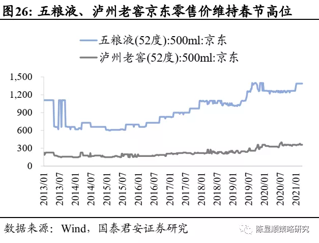 白酒:白酒价格稳定运行。京东零售价格显示截至3月23日,五粮液、泸州老窖价格仍然维持在春节水平,五粮液(52°)维持1389元/瓶的价格,泸州老窖(52°)价格较维持在358元/瓶的水平。
